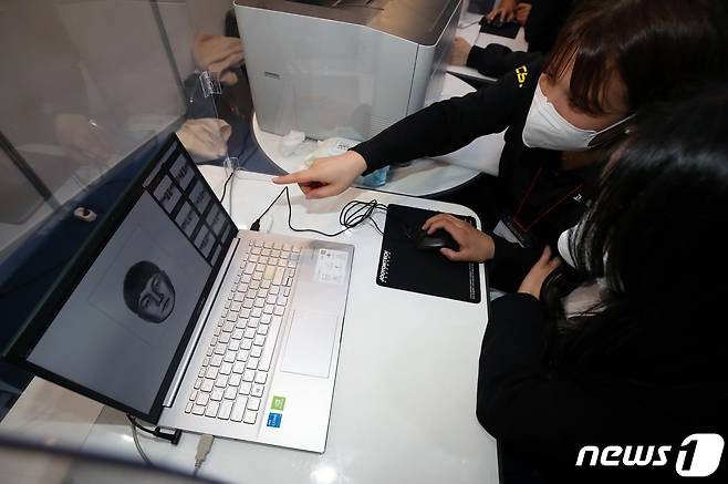 (인천=뉴스1) 정진욱 기자 = 20일 오후 인천시 연수구 송도컨벤시아에서 열린 2021 국제치안산업박람회에서 과학수사관이 참가자와 몽타주 만들기를 하고 있다. 2021.10.20/뉴스1