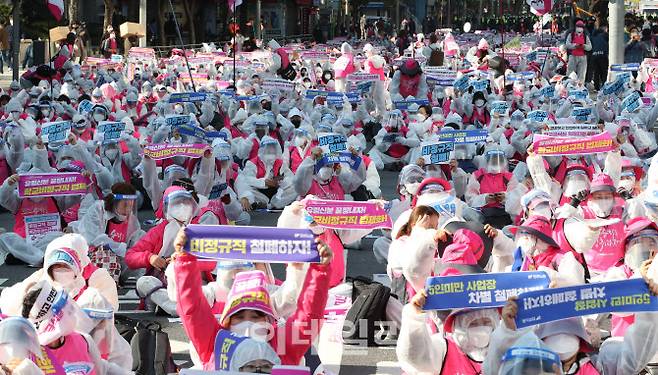 [포토]10·20 민주노총 총파업, 방호복 입고 집회