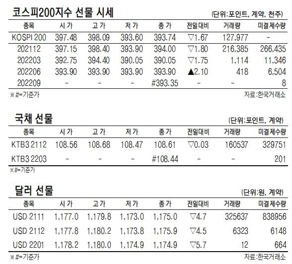 [표]코스피200지수 국채·달러 선물 시세(10월 20일)