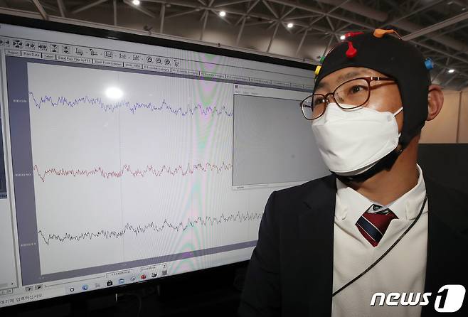 (인천=뉴스1) 정진욱 기자 = 20일 오후 인천시 연수구 송도컨벤시아에서 열린 2021 국제치안산업박람회에서 한 업체관계자가 법 심리 분석에 사용할 뇌파분석 장비를 시연하고 있다. 2021.10.20/뉴스1