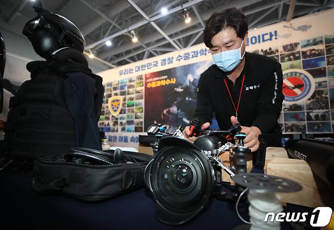 (인천=뉴스1) 정진욱 기자 = 20일 오후 인천시 연수구 송도컨벤시아에서 열린 2021 국제치안산업박람회에서 과학수사관이 수중과학수사장비를 살펴보고 있다. 2021.10.20/뉴스1