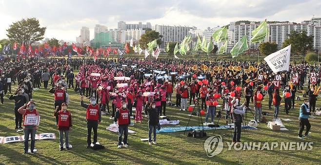 (울산=연합뉴스) 김용태 기자 = 20일 오후 울산시 남구 태화강 둔치에서 민주노총의 총파업 문화제가 열리고 있다. 2021.10.20