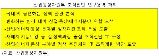 연구용역의 주요 내용은 국내외 급변하는 정책 환경 분석 및 산업·통상·에너지 조직의 바람직한 역할 모색, 부내·외 조직개편 수요 분석 및 분야별 정책추진체계 점검을 바탕으로 한 조직진단 진행, 정책기능 확대에 대비한 효과적인 정책 추진체계 및 조직개편 방향 제시 등이다. 산업부는 “기후변화 대응, 일자리·지역경제 활성화 등 앞으로의 산업부 정책 방향과 이에 맞춘 최적의 정부조직 형태를 고민하기 위해 진행하는 것”이라고 설명했다.