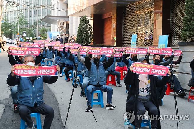 (서울=연합뉴스) 류효림 기자 = 택배노조 조합원들이 20일 오후 서울 중구 CJ대한통운 본사 앞에서 열린 사회적 합의 파기 CJ대한통운 규탄 전국택배노동조합 결의대회에서 구호를 외치고 있다. 2021.10.20