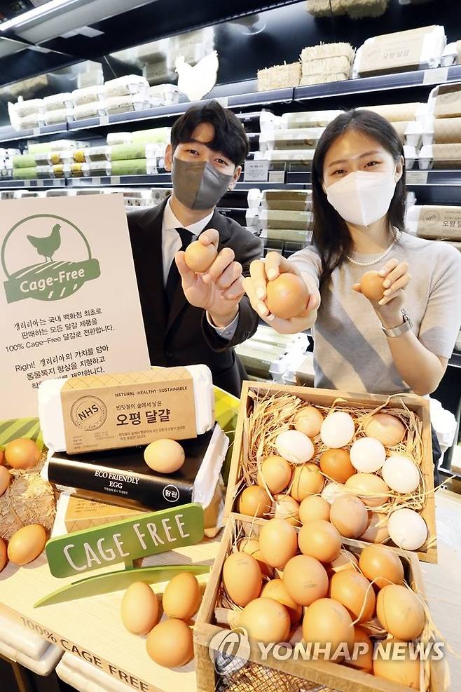 (서울=연합뉴스) 갤러리아백화점이 식품관에서 판매하는 모든 달걀을 '케이지 프리'(Cage-Free) 달걀로 전환한다고 20일 밝혔다. 케이지 프리는 케이지 등에 갇혀 자란 닭으로 생산된 달걀을 이용하지 않겠다는 뜻이다. 사진은 케이지 프리 달걀 선보이는 모델. 2021.10.20