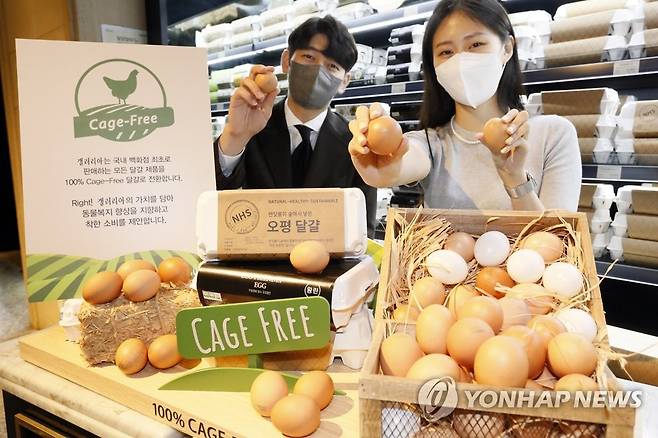 (서울=연합뉴스) 갤러리아백화점이 식품관에서 판매하는 모든 달걀을 '케이지 프리'(Cage-Free) 달걀로 전환한다고 20일 밝혔다. 케이지 프리는 케이지 등에 갇혀 자란 닭으로 생산된 달걀을 이용하지 않겠다는 뜻이다. 사진은 케이지 프리 달걀 선보이는 모델. 2021.10.20