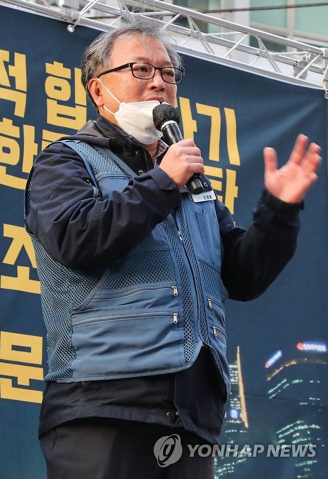 (서울=연합뉴스) 류효림 기자 = 진경호 택배노조위원장이 20일 오후 서울 중구 CJ대한통운 본사 앞에서 열린 사회적 합의 파기 CJ대한통운 규탄 전국택배노동조합 결의대회에서 발언하고 있다. 2021.10.20