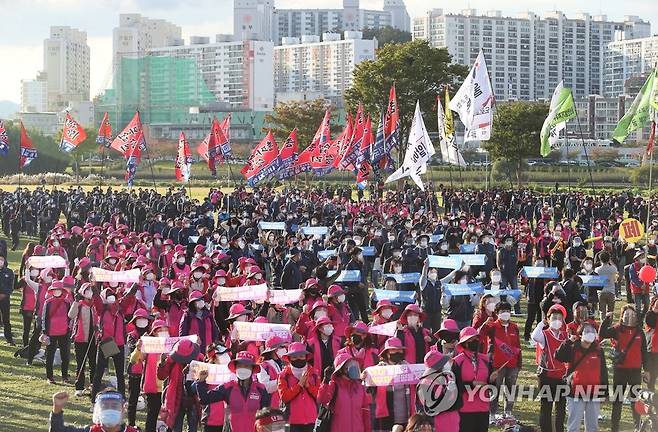 (울산=연합뉴스) 김용태 기자 = 20일 오후 울산시 남구 태화강 둔치에서 열린 민주노총의 총파업 문화제에서 각 지부의 깃발이 입장하고 있다. 021.10.20