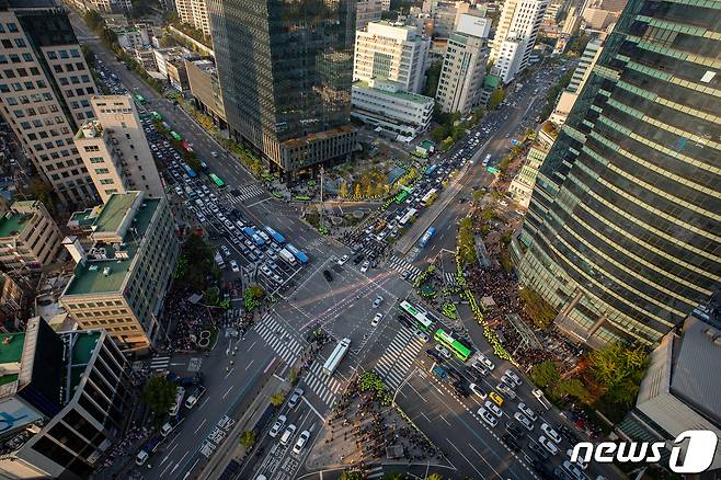 (서울=뉴스1) 유승관 기자 = 10.20 총파업에 돌입한 민주노총 조합원들이 20일 서울 서대문사거리에서 총파업 집회를 마친 후 해산, 차량 통행이 재개되고 있다. 2021.10.20/뉴스1