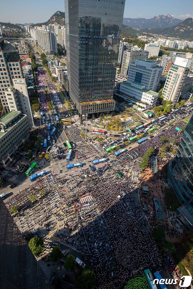 (서울=뉴스1) 유승관 기자 = 10.20 총파업에 돌입한 민주노총 조합원들이 20일 서울 서대문사거리를 점거해 총파업 집회를 열자 차량과 집회 참가자들이 뒤엉켜 정체가 이어지고 있다. 2021.10.20/뉴스1