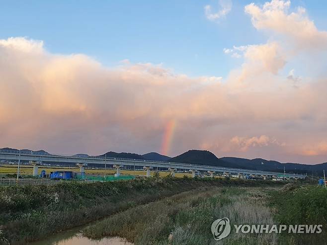 (포항=연합뉴스) 손대성 기자 = 20일 오후 경북 포항 북구 흥해읍 하늘에 선명한 무지개가 떠 눈길을 끌고 있다.