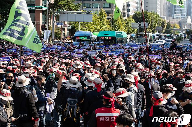 (서울=뉴스1) 유승관 기자 = 10.20 총파업에 돌입한 민주노총 조합원들이 20일 서울 서대문사거리에서 열린 총파업 집회에서 구호를 외치고 있다. 2021.10.20/뉴스1