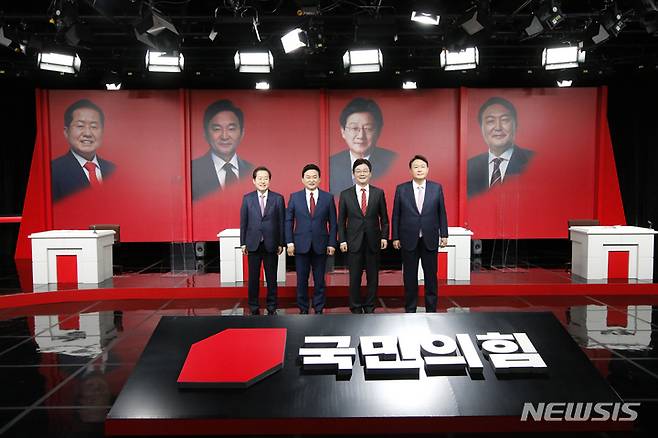 [대구=뉴시스] 이무열 기자 = 국민의힘 대선 경선 후보들이 20일 오후 대구MBC에서 열린 제20대 대통령선거 경선 후보 토론회에 앞서 기념촬영을 하고 있다. 왼쪽부터 홍준표, 원희룡, 유승민, 윤석열 후보. lmy@newsis.com