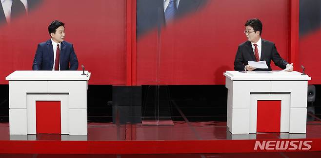 [대구=뉴시스] 이무열 기자 = 20일 오후 대구MBC에서 열린 국민의힘 대선 경선 후보 대구·경북 합동토론회에 앞서 원희룡, 유승민 후보가 얘기 나누고 있다. 2021.10.20. lmy@newsis.com