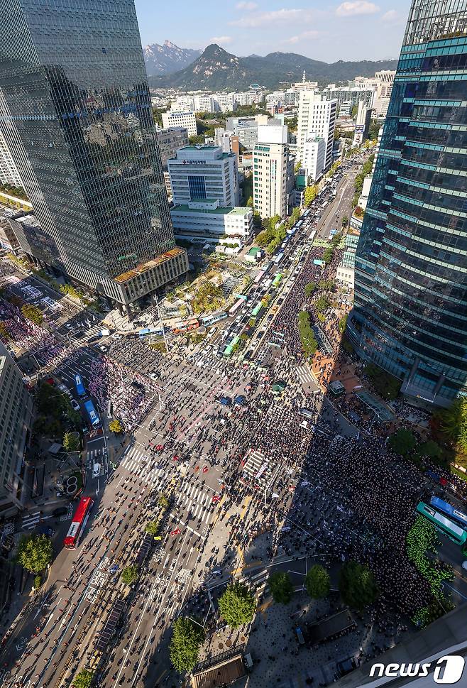 (서울=뉴스1) 유승관 기자 = 10.20 총파업에 돌입한 민주노총 조합원들이 20일 서울 서대문사거리를 점거, 총파업 집회를 열고 있다. 2021.10.20/뉴스1