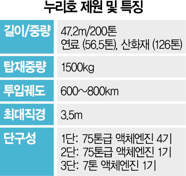 △누리호 구성은=누리호는 75톤 추력을 내는 로켓엔진 4개를 클러스터링해 핵심인 1단부(대기권 돌파용·고도 59㎞ 분리)로 사용하고 75톤 엔진 1개와 7톤 엔진 1개를 각각 2단부(고도 258㎞ 분리)와 3단부(700㎞ 궤도 안착용)로 쓴다. 높이는 47.2m, 중량은 200톤(연료 56.5톤, 산화제 126톤)이다. 성공하면 세계 7번째 중대형 액체 로켓엔진 개발 국가가 된다.