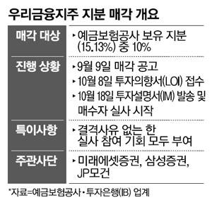 이후 매각 일정은 11월 18일 오후 5시까지 입찰제안서를 접수하고, 같은 달 22일께 낙찰자 선정으로 이어진다. 이번 거래가 성공적으로 끝나면 우리금융은 사실상 완전한 민영화를 달성하게 된다. 예보 지분이 10% 아래로 내려감에 따라 예보가 최대주주 지위와 비상임이사 추천권을 상실하기 때문이다. 사외이사 추천권은 4% 이상의 지분을 취득하는 투자자에게 돌아간다. 일각에선 공자위가 지분을 4%, 4%, 2%로 쪼개 최대 3곳에 매각할 것으로 보고 있다. 현행 금융지주회사법상 '비금융주력자'가 4%를 초과하는 금융사 지분을 보유하려면 엄격한 대주주 자격 심사를 거쳐야 하는 상황이다. 과거 푸본금융그룹이 우리금융 지분을 살 때도 대량 지분 매수를 노렸으나 이 같은 절차 때문에 4%까지만 보유하고 있는 것으로 알려졌다.