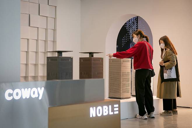 이번 전시에 소개되는 노블 공기청정기는 코웨이만의 혁신적인 에어테크놀로지를 접목해 강력한 4면 입체청정과 에어클린항균필터 시스템으로 집안 공기를 깨끗하게 케어 한다. 건축물에서 영감을 얻은 프리미엄 아키텍처 디자인은 공간을 세련된 분위기를 연출해준다.