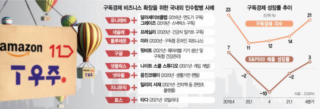 ◇오픈 컬래버 본격화하는 구독 생태계=구독경제가 활성화된 해외에서는 구독 비즈니스 확장을 위한 글로벌 기업들의 다양한 오픈 컬래버레이션 움직임이 활발하다. 글로벌 소비재 기업 유니레버는 2016년 면도기 정기 배송 업체인 ‘달러셰이브클럽’을 10억 달러에 인수했고 2019년에는 고객의 건강 상태와 체질에 따른 스낵을 정기 배송하는 영국의 ‘그레이즈’도 인수했다. 캐나다의 글로벌 스포츠웨어 룰루레몬은 지난해 온라인 피트니스 업체인 ‘미러’를 5억 달러에 인수하기로 했다. 미러는 벽걸이형 디지털 거울을 통해 스트리밍 형태의 일대일 개인 운동 서비스를 구독형으로 제공한다. 코로나19 팬데믹(세계적 대유행)으로 운동복 매출이 줄어들던 상황에서 디지털 헬스케어 회사를 인수하면서 구독 비즈니스에 뛰어들어 위기를 넘겼을 뿐 아니라 장기 성장 동력도 확보했다. 삼정KPMG 경제연구원은 “구독 비즈니스를 이끌어갈 장기적 모멘텀을 가져가기 위해서는 자사와 시너지를 창출할 수 있는 기업에 대한 M&A·투자 또는 산업 간 연합체 구성, 파트너십 등 다양한 방안을 검토할 수 있다”고 분석했다.