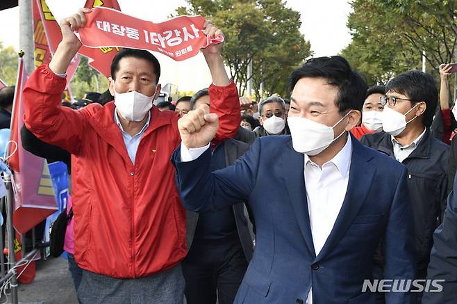 [대구=뉴시스] 이무열 기자 = 원희룡 국민의힘 대선 경선 후보가 20일 오후 대구MBC에서 열리는 제20대 대통령선거 경선 후보 토론회에 입장하기에 앞서 지지자들과 인사를 나누고 있다. 202110.20. lmy@newsis.com
