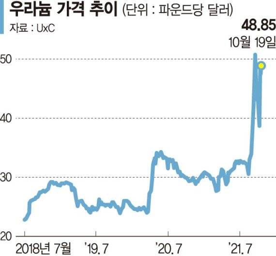 우라늄 가격을 추적하는 UxC에 따르면 우라늄 현물 가격은 8월초 파운드당 32.25달러에서 이달 19일 48.85달러까지 약 50% 급등했다. 2007년 사상최고치 137달러에 비해서는 크게 낮은 수준이지만 상승세가 가파른데다, 전력난이 지속되고 있어 앞으로도 가격이 더 뛸 것으로 보인다