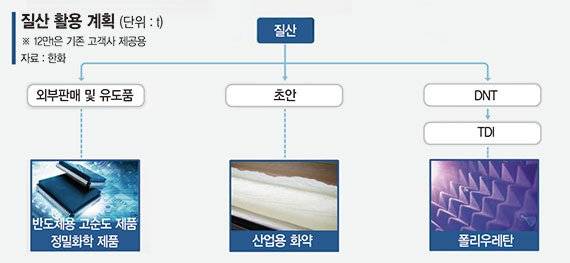 한화 관계자는 "질산 생산 증설 및 과감한 R&D 투자로 각종 친환경 고부가가치 질산 유도체를 개발해 반도체 및 케미칼 소재 분야 등으로 사업 영역을 확장한다는 계획"이라며 "국내에서 유일하게 보유하고 있는 수도권 내 대형 암모니아 저장시설 및 암모니아 관련 기술을 바탕으로 수소 공급과 유통관리 사업을 추진할 것"이라고 말했다.