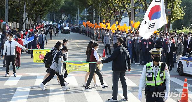 [대구=뉴시스] 이무열 기자 = 20일 오후 대구MBC에서 열리는 국민의힘 대선 경선 후보들의 대구·경북 합동토론회를 앞두고 각 후보의 지지자들이 방송국 진입로에 몰려 인근 중·고등학교 주변이 혼잡을 빚고 있다. 2021.10.20. lmy@newsis.com