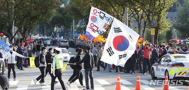 [대구=뉴시스] 이무열 기자 = 20일 오후 대구MBC에서 열리는 국민의힘 대선 경선 후보들의 대구·경북 합동토론회를 앞두고 각 후보의 지지자들이 방송국 진입로에 몰려 인근 중·고등학교 주변이 혼잡을 빚고 있다. 2021.10.20. lmy@newsis.com