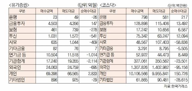 [표]유가증권 코스닥 투자주체별 매매동향(10월 20일-최종치)