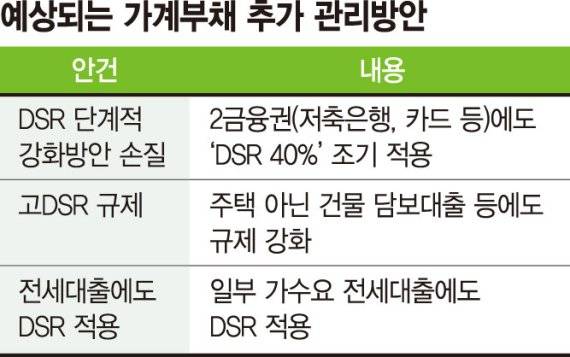 즉 내년 7월 1금융권에 적용하는 '차주별 DSR 40%'를 앞당겨 적용하는 방안과 DSR 40% 적용 예외 차주까지 적용하는 방안 등이다.