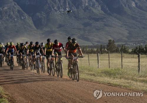 epa09533888 Professional elite riders in action during Stage 3 of the 2021 Absa Cape Epic mountain bike race over 91km including 2,100m of climbing, near Saronsberg, South Africa, 20 October 2021. This years event sees 600 riders tackle 620km over eight days of riding and 15,350m of vertical ascent. The race includes UCI pro riders and amateurs in what is seen by many as the premier MTB stage race in the world. EPA/KIM LUDBROOK