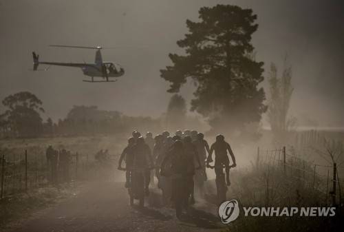 epa09533895 Professional elite riders race in the early morning light during Stage 3 of the 2021 Absa Cape Epic mountain bike race over 91km including 2,100m of climbing, near Saronsberg, South Africa, 20 October 2021. This years event sees 600 riders tackle 620km over eight days of riding and 15,350m of vertical ascent. The race includes UCI pro riders and amateurs in what is seen by many as the premier MTB stage race in the world. EPA/KIM LUDBROOK