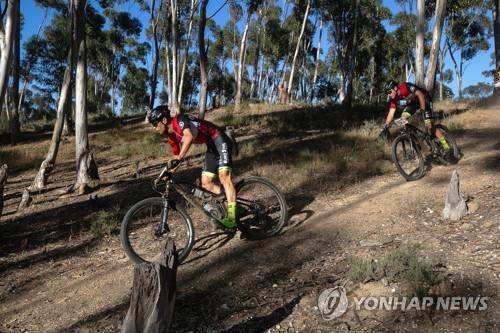 epa09533938 Stage leaders team PYGA Euro Steel riders Philip Buys (L) and Pieter Du Toit (R), both of South Africa, race through a forest during Stage 3 of the 2021 Absa Cape Epic mountain bike race over 91km including 2,100m of climbing, near Saronsberg, South Africa, 20 October 2021. This years event sees 600 riders tackle 620km over eight days of riding and 15,350m of vertical ascent. The race includes UCI pro riders and amateurs in what is seen by many as the premier MTB stage race in the world. EPA/KIM LUDBROOK