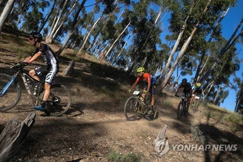 epa09533939 Professional elite riders race through a forest in the early morning light during Stage 3 of the 2021 Absa Cape Epic mountain bike race over 91km including 2,100m of climbing, near Saronsberg, South Africa, 20 October 2021. This years event sees 600 riders tackle 620km over eight days of riding and 15,350m of vertical ascent. The race includes UCI pro riders and amateurs in what is seen by many as the premier MTB stage race in the world. EPA/KIM LUDBROOK