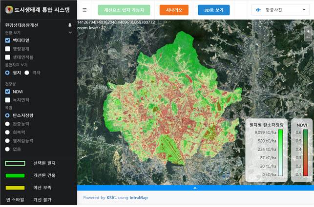 오규식 한양대 도시공학과 교수는 “이번 시스템은 도시 건강성을 나타내는 대표 지표인 NDVI, 녹지면적과 도시 생태 복원능력 지표인 탄소저장량, 완충 능력, 회복력, 열 저감 능력 등 각 지표를 선택해 가시화할 수 있다”면서 “수치에 따라 색상이 달리 표현돼 한눈에 파악이 용이하다”고 설명했다.