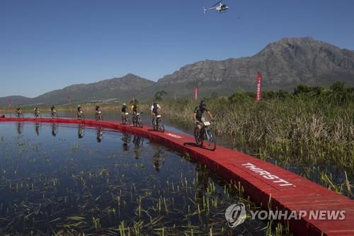 epa09533941 Professional elite riders led by Team Bulls 2 rider Simon Stiebjahn (R) of Germany cross a floating bridge during Stage 3 of the 2021 Absa Cape Epic mountain bike race over 91km including 2,100m of climbing, near Saronsberg, South Africa, 20 October 2021. This years event sees 600 riders tackle 620km over eight days of riding and 15,350m of vertical ascent. The race includes UCI pro riders and amateurs in what is seen by many as the premier MTB stage race in the world. EPA/KIM LUDBROOK