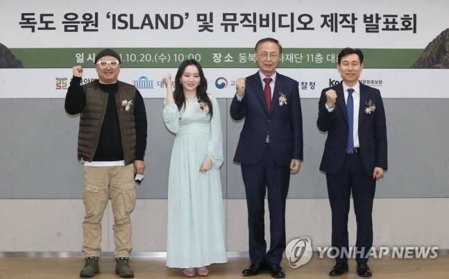 동북아역사재단은 '독도의 날'을 닷새 앞둔 20일 서울 서대문구 재단 대회의실에서 제작 발표회를 열어 여러 예술가들이 재능기부 형태로 참여해 완성된 독도 노래 '아일랜드' 음원과 뮤직비디오를 선보였다.