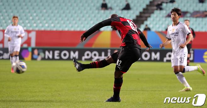 (전주=뉴스1) 유경석 기자 = 20일 전북 전주시 전주월드컵경기장에서 열린 '2021 아시아축구연맹(AFC) 챔피언스리그(ACL) 4강전 울산 현대와 포항 스틸러스의 경기에서 포항 팔라시오스가 슛을 하고 있다. 2021.10.20/뉴스1