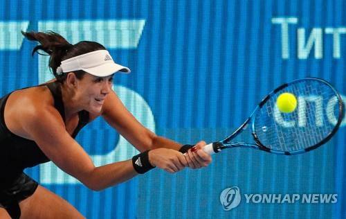 epa09533973 Garbine Muguruza of Spain in action against Tereza Martincova of the Czech Republic during their women's second round match at the Kremlin Cup tennis tournament in Moscow, Russia, 20 October 2021. EPA/SERGEI ILNITSKY