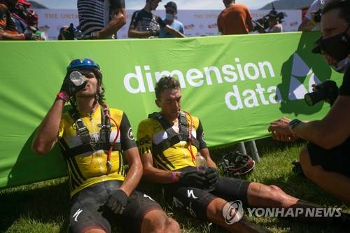 epa09533977 Race leaders NinetyOne-songo-Specialized riders Matt Beers (L) of South Africa and Jordan Sarrou (R) of France recover after Stage 3 of the 2021 Absa Cape Epic mountain bike race over 91km including 2,100m of climbing, near Saronsberg, South Africa, 20 October 2021. This years event sees 600 riders tackle 620km over eight days of riding and 15,350m of vertical ascent. The race includes UCI pro riders and amateurs in what is seen by many as the premier MTB stage race in the world. EPA/KIM LUDBROOK