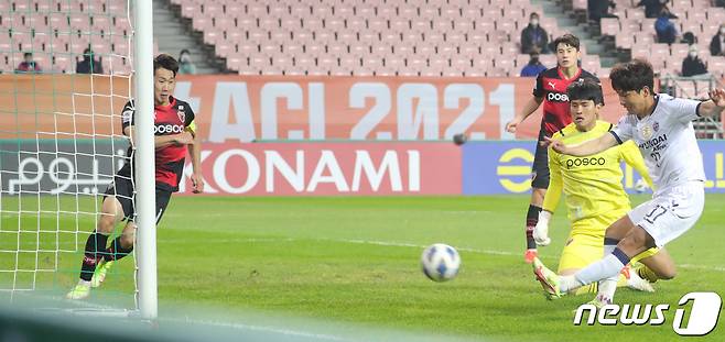 (전주=뉴스1) 유경석 기자 = 20일 전북 전주시 전주월드컵경기장에서 열린 '2021 아시아축구연맹(AFC) 챔피언스리그(ACL) 4강전 울산 현대와 포항 스틸러스의 경기에서 울산 윤일록이 슛을 하고 있다. 2021.10.20/뉴스1