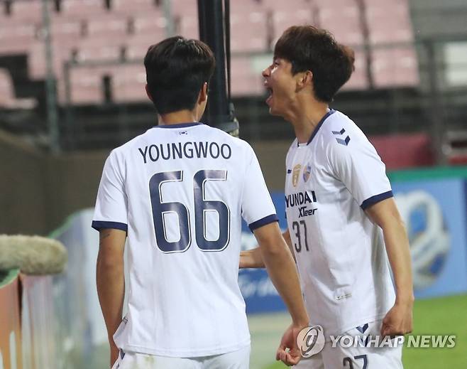 (전주=연합뉴스) 최영수 기자 = 20일 오후 전북 전주월드컵경기장에서 열린 아시아축구연맹(AFC) 챔피언스리그(ACL) 준결승전. 포항에 첫 골을 넣은 윤일록(왼쪽)이 포효하고 있다. 2021.10.20