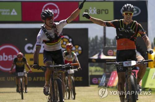 epa09533994 Stage winners Team Canyon Northware MTB riders Andreas Seewald (L) of Germany and Martin Stosek (R) of the Czech Republic celebrate after winning Stage 3 of the 2021 Absa Cape Epic mountain bike race over 91km including 2,100m of climbing, near Saronsberg, South Africa, 20 October 2021. This years event sees 600 riders tackle 620km over eight days of riding and 15,350m of vertical ascent. The race includes UCI pro riders and amateurs in what is seen by many as the premier MTB stage race in the world. EPA/KIM LUDBROOK