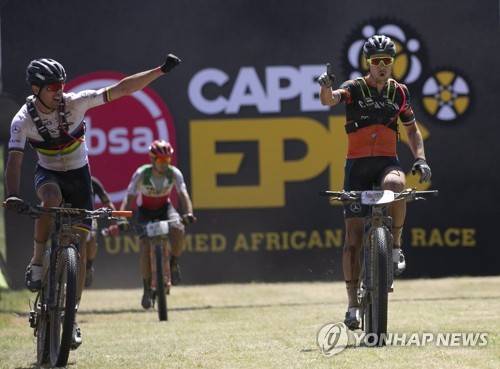 epa09533996 Stage winners Team Canyon Northware MTB riders Andreas Seewald (L) of Germany and Martin Stosek (R) of the Czech Republic celebrate after winning Stage 3 of the 2021 Absa Cape Epic mountain bike race over 91km including 2,100m of climbing, near Saronsberg, South Africa, 20 October 2021. This years event sees 600 riders tackle 620km over eight days of riding and 15,350m of vertical ascent. The race includes UCI pro riders and amateurs in what is seen by many as the premier MTB stage race in the world. EPA/KIM LUDBROOK