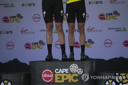 epa09533995 Race leaders NinetyOne-songo Specialized riders Jordan Sarrou (R) of France and Matt Beers (L) of South Africa stand on the podium after retaining the leaders' yellow jersey following Stage 3 of the 2021 Absa Cape Epic mountain bike race over 91km including 2,100m of climbing, near Saronsberg, South Africa, 20 October 2021. This years event sees 600 riders tackle 620km over eight days of riding and 15,350m of vertical ascent. The race includes UCI pro riders and amateurs in what is seen by many as the premier MTB stage race in the world. EPA/KIM LUDBROOK