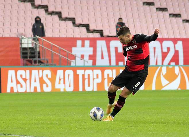 [전주=뉴시스] 김얼 기자 = 2021 아시아축구연맹(AFC) 챔피언스리그(ACL) 4강전 울산 현대와 포항 스틸러스의 경기가 열린 17일 전북 전주시 전주월드컵경기장에서 포항 스틸러스 크베시치 선수가 패스를 하고 있다. 2021.10.20. pmkeul@newsis.com