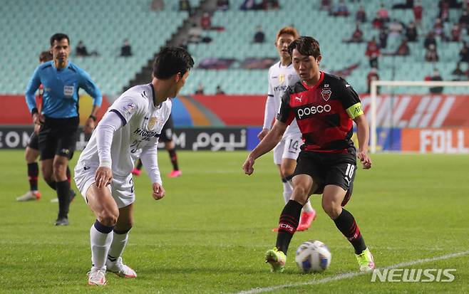 [전주=뉴시스] 김얼 기자 = 2021 아시아축구연맹(AFC) 챔피언스리그(ACL) 4강전 울산 현대와 포항 스틸러스의 경기가 열린 17일 전북 전주시 전주월드컵경기장에서 포항 스틸러스 강상우 선수가 돌파를 시도하고 있다. 2021.10.20. pmkeul@newsis.com