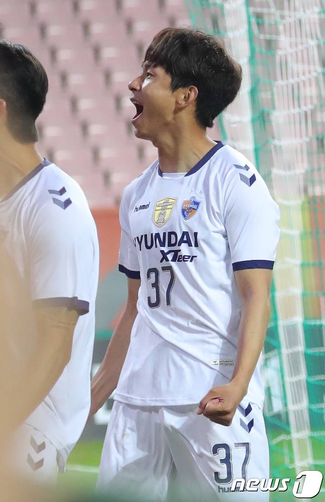 (전주=뉴스1) 유경석 기자 = 20일 전북 전주시 전주월드컵경기장에서 열린 '2021 아시아축구연맹(AFC) 챔피언스리그(ACL) 4강전 울산 현대와 포항 스틸러스의 경기에서 울산 윤일록이 선제골을 넣은 후 포효하고 있다. 2021.10.20/뉴스1
