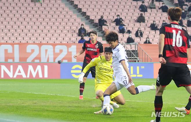 [전주=뉴시스] 김얼 기자 = 2021 아시아축구연맹(AFC) 챔피언스리그(ACL) 4강전 울산 현대와 포항 스틸러스의 경기가 열린 17일 전북 전주시 전주월드컵경기장에서 울산 현대 윤일록 선수가 슛을 하고 있다. 2021.10.20. pmkeul@newsis.com