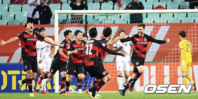 후반 포항 그랜트가 동점골을 작렬시킨 뒤 동료들과 환호하고 있다. 2021.10.20 / dreamer@osen.co.kr